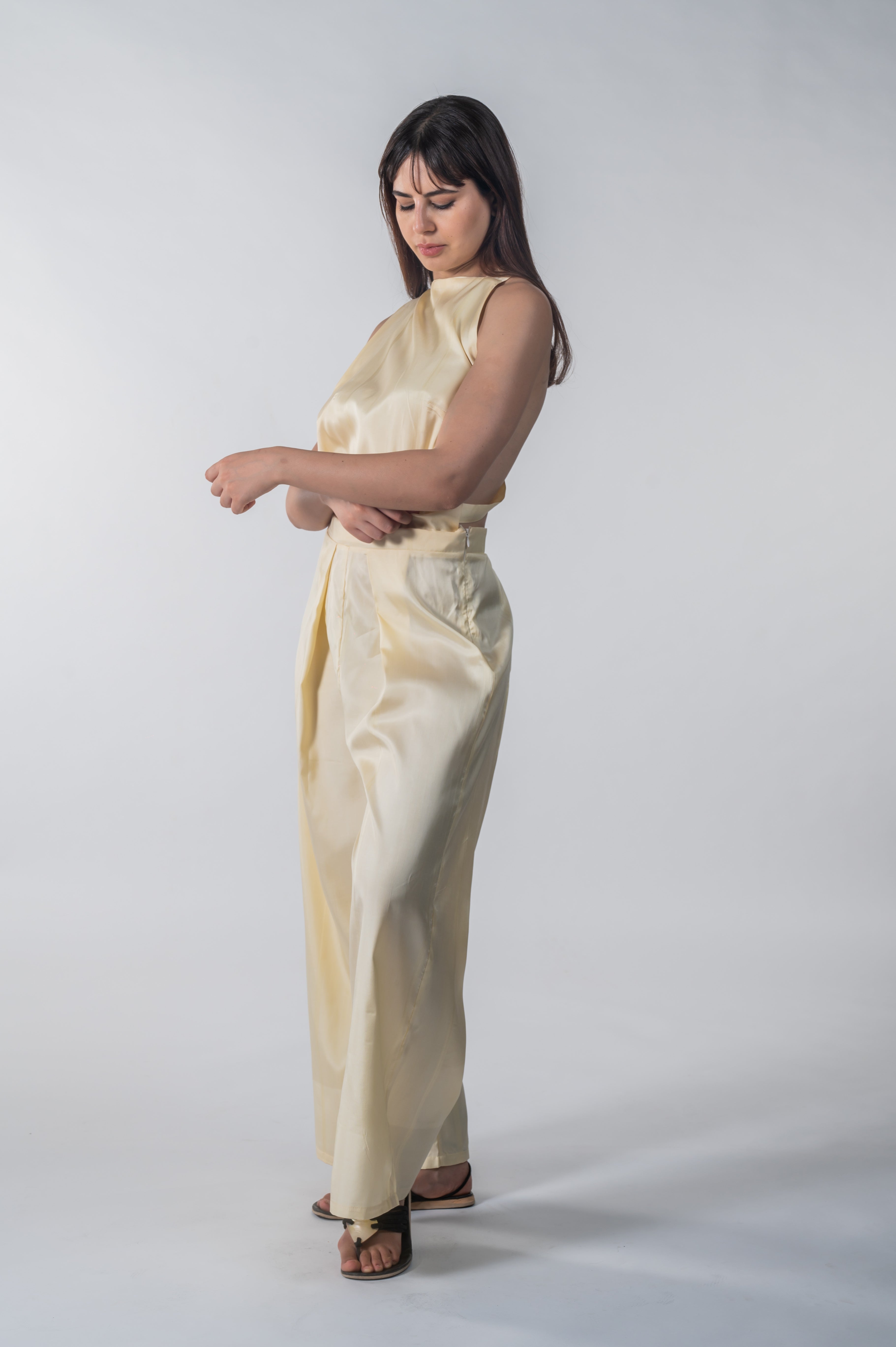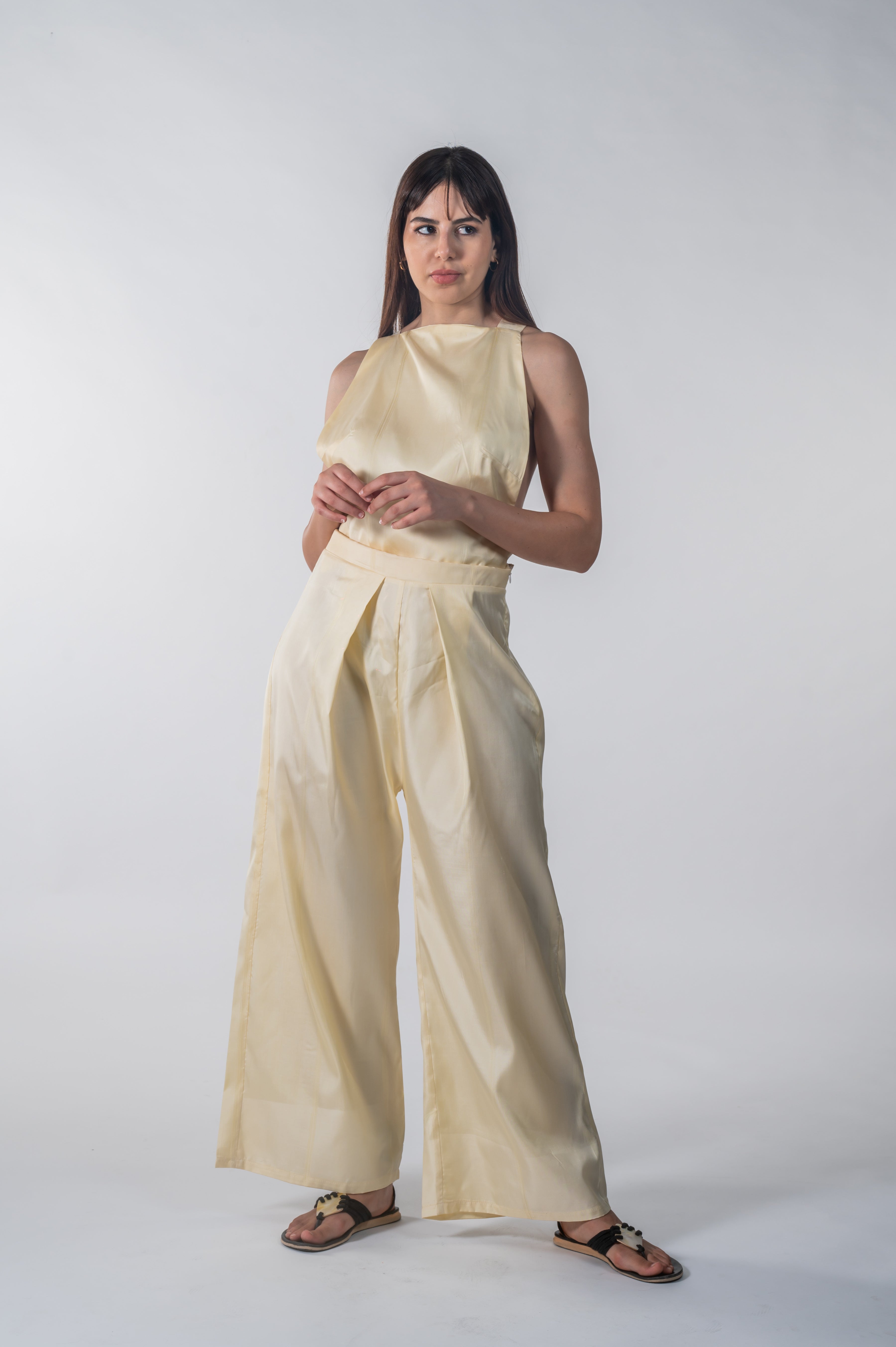 Its lightweight silk flows naturally, with a cross-back and wide-leg silhouette designed for ease and quiet sophistication.